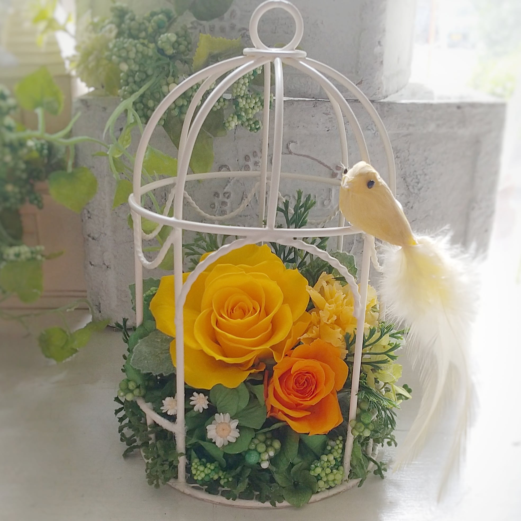 元気が出る鮮やかなイエローとフルーティーオレンジのバラにカーネーション 様々なグリーンを 鳥かごの中にアレンジしました。明るい春の陽だまりの中にいるみたい 。.:*:・'°☆.。ちょこんととまっている鳥が可愛いです。(3枚目の写真のように鳥を付けないこともできます)