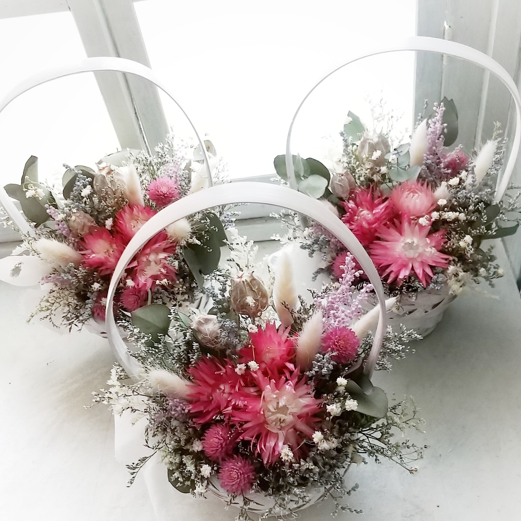 白いナチュラルでシャビーな籠に ドライフラワーをあふれそうにアレンジしました。