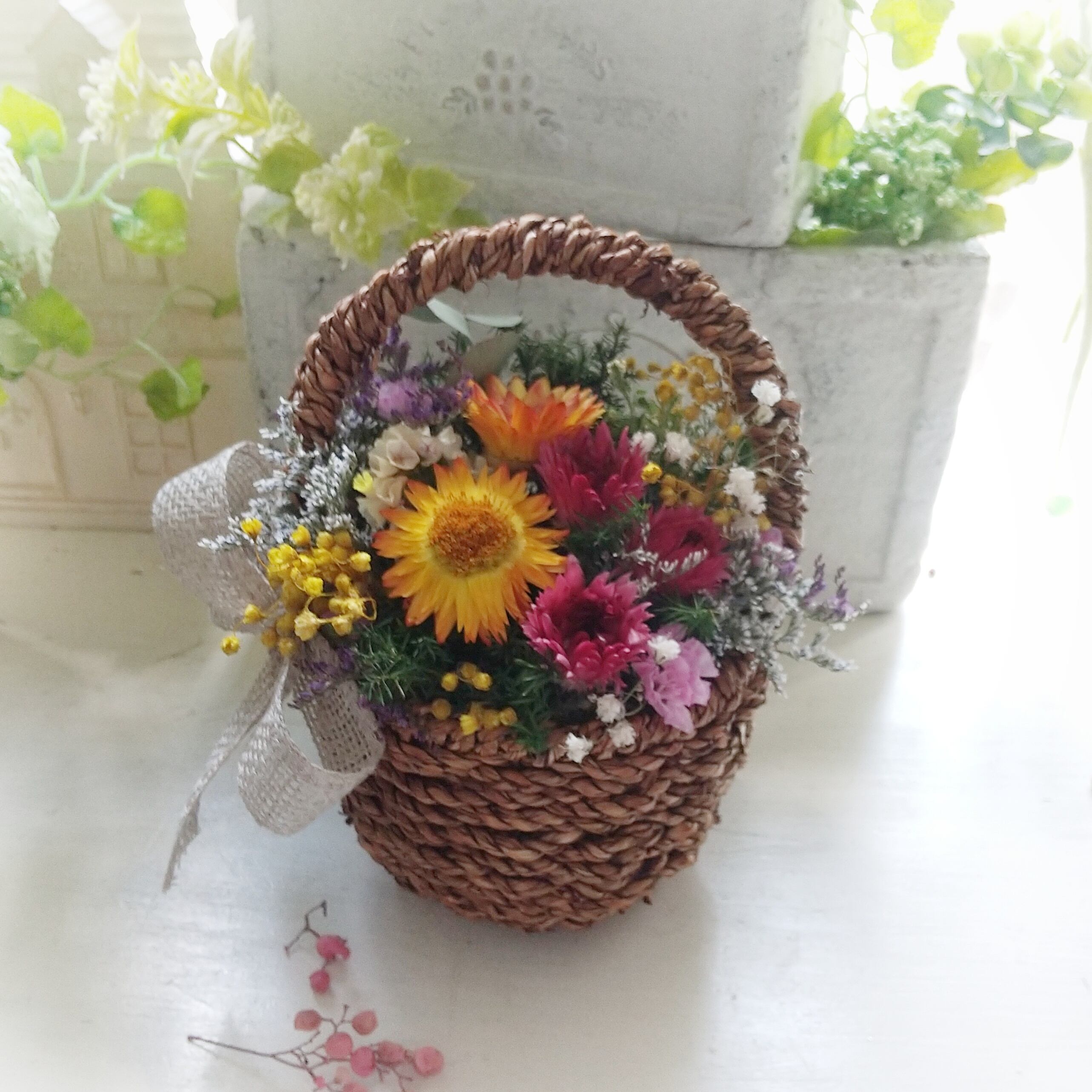 ナチュラルでコロンとした丸い籠に ドライフラワーをあふれそうにアレンジしました。リネンのリボンが可愛い♡