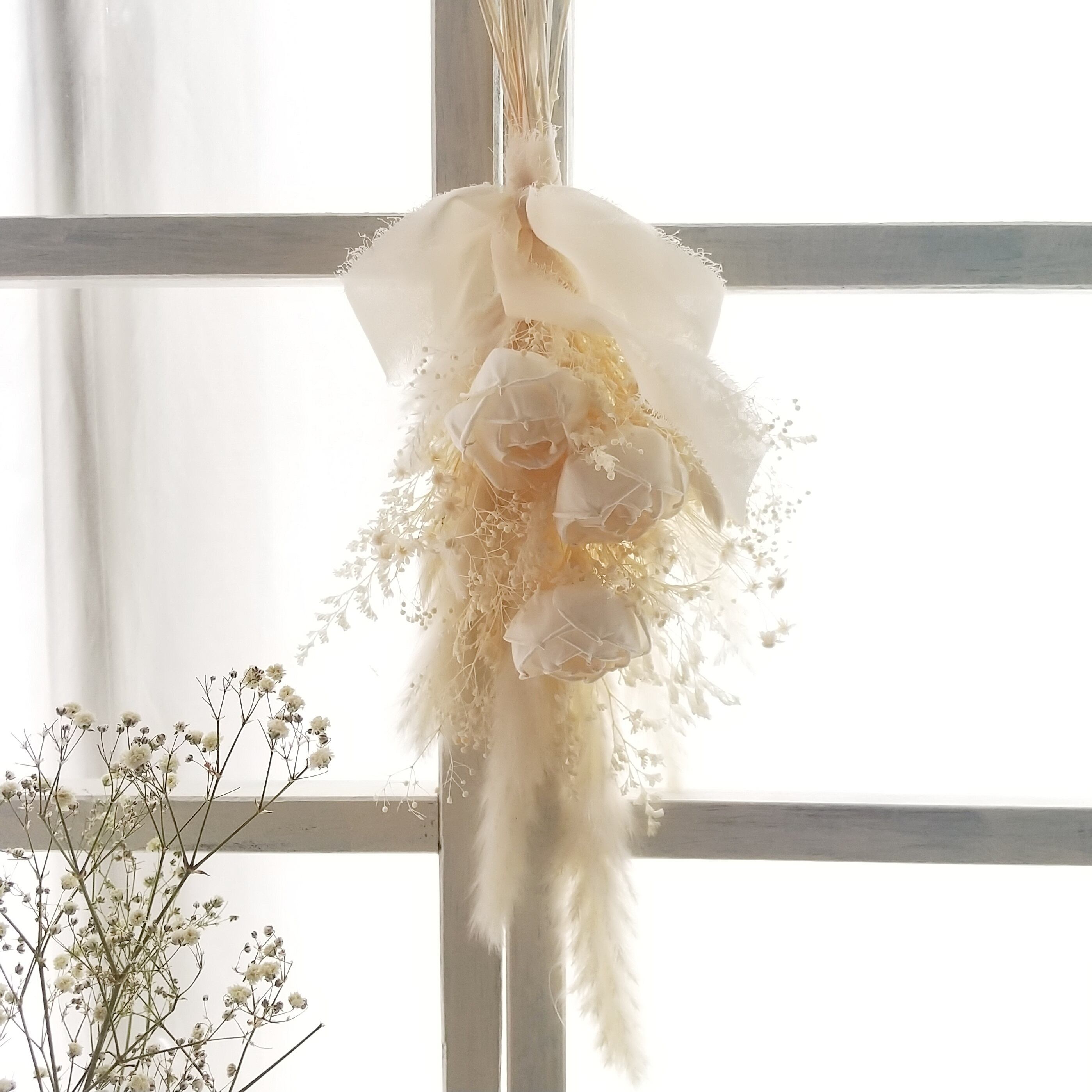 ソーラーフラワーを中心にパンパスやラグラス等白いドライフラワーばかりで作ったスワッグです。パンパスとラグラスのふわふわが可愛くてお洒落です。.:*:・'°☆.・転がしておくだけでも絵になります。